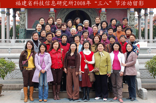2008年3月7日,為慶!叭恕眹(guó)際勞動(dòng)?jì)D女節(jié),省科技信息研究所婦委會(huì)組織女職工前往長(zhǎng)樂(lè)顯應(yīng)宮、鄭和公園等地參觀學(xué)習(xí),開(kāi)闊眼界,增長(zhǎng)知識(shí)。全所在職、離退休女職工共47人(其中還有80高齡的老同志)參加了活動(dòng)。在參觀學(xué)習(xí)過(guò)程中,通過(guò)有關(guān)人員的詳細(xì)講解和現(xiàn)場(chǎng)參觀咨詢(xún),全所女職工深入了解了歷史古跡的規(guī)模現(xiàn)狀、建設(shè)歷史等方面的知識(shí),深切領(lǐng)會(huì)了其中的文化內(nèi)涵和領(lǐng)略了古代建筑的魅力。通過(guò)此次活動(dòng),進(jìn)一步豐富了女職工的文化生活,促進(jìn)溝通和交流,增進(jìn)團(tuán)結(jié)和協(xié)作,受到大家的一致好評(píng)。