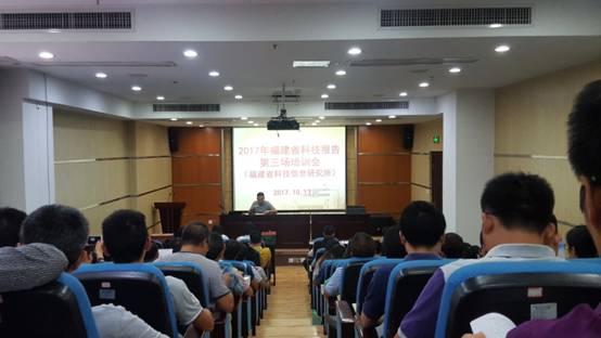 根據《福建省科技報告制度建設工作方案》要求,2017年省科技廳確定繼續在省屬公益類科研院所專項項目開展科技報告推廣和培訓工作。為此,省科技報告管理中心在省科技廳發展計劃處的指導和各協辦單位的支持下,制訂了周密的培訓工作計劃,于10月11—19日,先后在省農業科學院、省水產研究所和省信息所舉辦了6場科技報告培訓會。