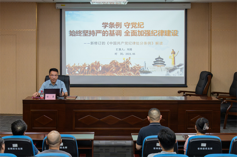 為推動黨紀學習教育走深走實,6月27日,我所黨總支紀檢委員劉勇以《學條例 守黨紀——始終堅持嚴的基調 全面加強紀律建設》為題,為全所黨員、中層干部及分管科室講黨紀學習教育專題黨課。